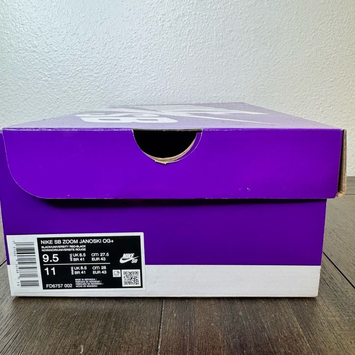 The Nike SB Zoom Janoski OG+ returns with modern performance upgrades while honoring its iconic skate heritage. This Black and Red colorway features a clean, timeless aesthetic that works both on and off the board. Built with Zoom Air cushioning for responsive impact protection and a reinforced toe cap for durability during tricks and everyday wear. The gum rubber outsole delivers excellent grip and board feel, while the padded collar ensures comfort during extended sessions. Size 9.5 Men's. Style FD6757-002. Brand new, unworn condition. Perfect for skaters seeking a legendary silhouette with contemporary comfort technology.